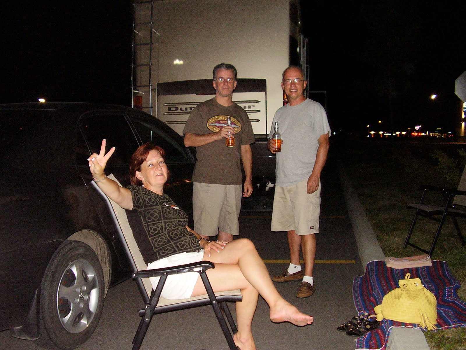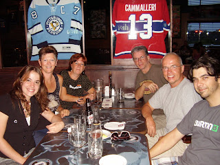 Durant les derniers jours précédents notre départ nous nous sommes affairés à ranger les items que nous ne pouvions apporter avec nous tel le barbecue, nos chaises, table et éléments de parterre et à compléter nos dernières démarches pour le renouvellement par anticipation des plaques de la voiture et l'obtention de nos derniers documents d'assurances voyages. Viens ensuite la rencontre avec les propriétaires du camping pour nous assurer de régler notre compte d'électricité et réserver notre terrain pour la prochaine saison. Bien que ces items soient sans importance pour vous chers lecteurs vous comprendrez que nous nous sommes régulièrement questionnés ces derniers jours à savoir si nous avions tout prévu pour les 9 prochains mois... Évènements vraiment plus intéressants que les précédents ont été les rencontres avec tous nos parents, enfants et petits-enfants avant notre départ. Quels bons moments passés en leur compagnie, moments que nous allons chérir précieusement. Alors en route ce 15 Juillet au matin vers Montréal, nos amis du camping nous saluant de la main lorsque nous circulons en motorisé vers la sortie en nous donnant rendez-vous le printemps prochain. Voulant préserver notre routine de lancement du dernier voyage nous nous sommes dirigé vers le Walmart du Quartier 10-30 de Brossard en y donnant rendez-vous à Yves/Marie-Josée et Claire/ Laurent. Bonne bouffe, bonnes bières et beaucoup de bavardage ont scellés le départ vers cette nouvelle aventure.