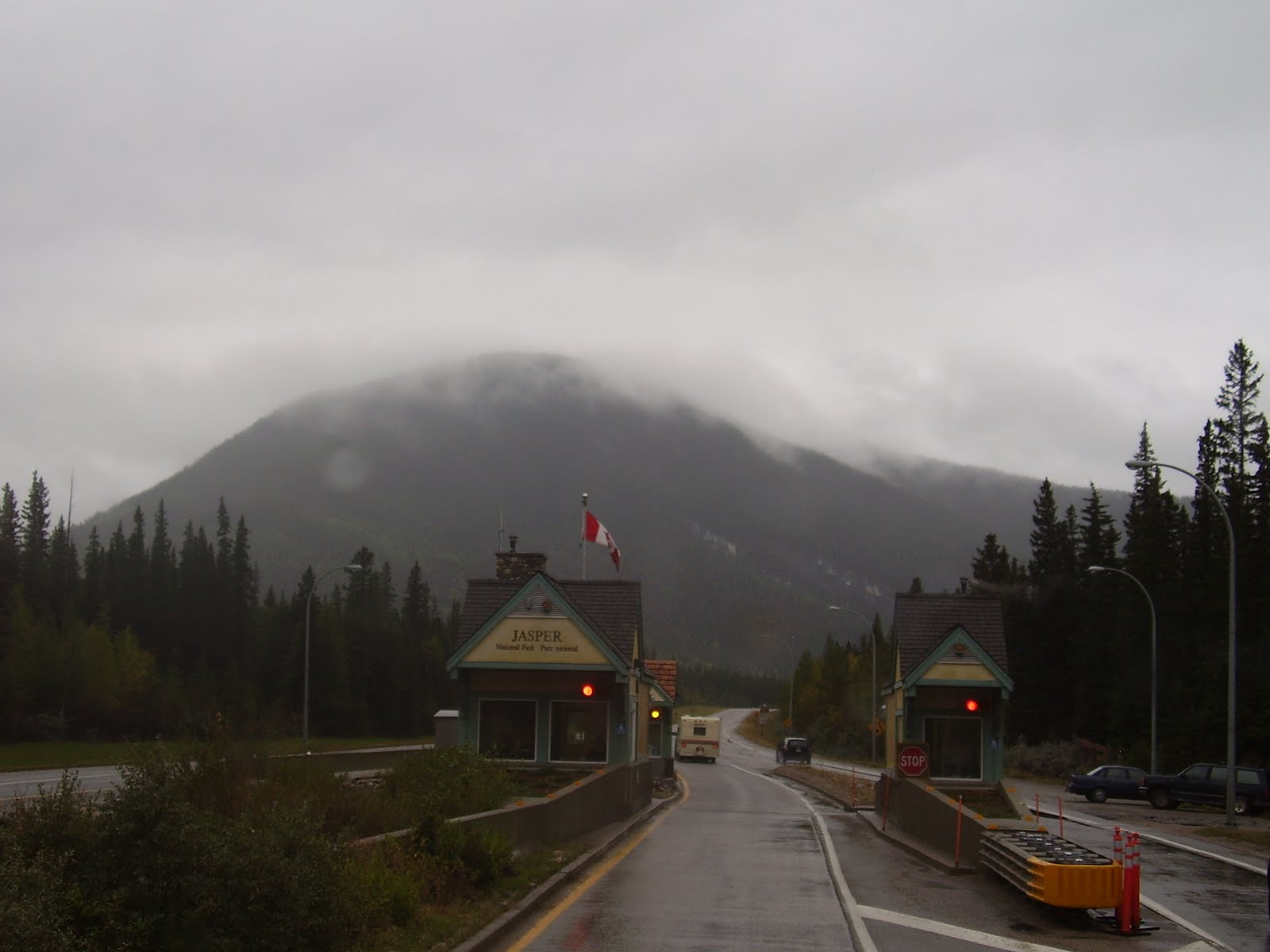 Journée qui s'annonçait intéressante pour voyager avec un ciel bleu et plein de soleil mais les prévisions météo nous réservaient des averses sur la route vers Jasper. Cela était plutôt décevant parce que j'en avais profité la veille pour laver l'extérieur du motorisé ainsi que celui de la voiture. Les véhicules sont maltraités lorsque la route est détrempé surtout la voiture attaché au motorisé laquelle reçoit toute la bruine soulevé par le VR cette dernière étant pleine de roches et de résidus d'asphalte. Le trajet vers Jasper s'est bien déroulé et ce qui était prévu comme météo s'est matérialisé faisant en sorte que le plafond nuageux ne laissait pas de place au paysage montagneux que nous traversions. Nous traversons la barrière du parc et payons notre droit d'accès de $136 en plus de nos frais de camping journaliers lesquels ne sont pas les plus économiques rencontrés jusqu'à ce jour. Mais bon, nous voulons voir les Rocheuses alors....