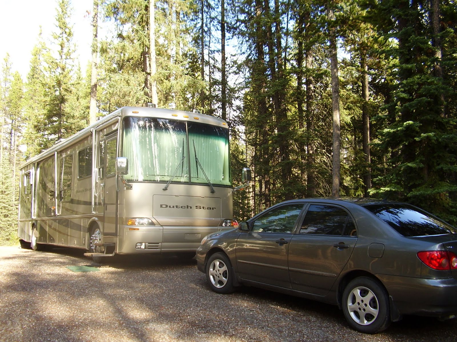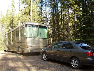 Une pluie intense nous attendait au levée ce qui n'augurait rien de bon pour la préparation de notre départ. J'avais installé les bicyclettes au support de la voiture la journée précédente prenant soin de leur faire un petit nettoyage et lubrification comprenant qu'elles font tous les trajets beau temps mauvais temps en plein air. Prêts pour le départ, nous approchons la voiture vers l'arrière du motorisé pour installer les fixations de remorquage. Nous remarquons que l'une d'elles démontre une défectuosité laquelle empêche l'un des bras d'accrochage de se barrer lorsqu'il est attaché. Alors on ouvre le coffre à outils et on se met en mode réparation sous la pluie pour nous permettre de prendre la route. Nous réussirons à compléter une réparation temporaire après plus d'une heure d'effort et quitterons le campement avec un léger retard sur l'heure habituelle de départ. La ville de Banff n'est qu'à 60KM de Lac Louise et le trajet se fera sous la pluie. En après-midi après avoir installé notre campement tout près du centre des activités nous nous rendrons sur la rue principale de Banff pour y trouver un café internet et mettre nos communications à jour. Nous serons au Second Cup durant plus de 4 heures... mais cela en vaudra la peine. Nous espérons que nous pourrons visiter un peu demain si la température le permet. A suivre.