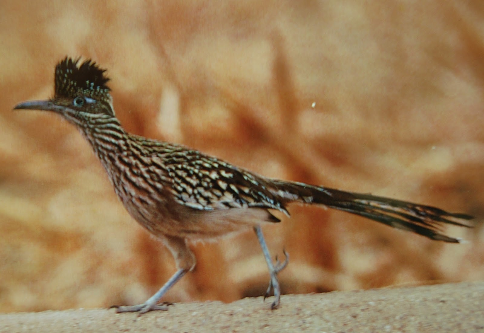 Nous connaissons tous le Roadrunner des émissions télévisé de notre jeunesse et le défi est d'en rencontrer un lorsque nous nous retrouvons dans des régions désertiques comme celles de l'Arizona. J'avais fait un souhait au début de ce périple soit d'en rencontrer un. Nous sommes actuellement dans un Resort de résidents retraités près des grands espaces entourant la ville de Tucson. En plus des cactus partout présents tout autour de nous dans lesquels les oiseaux font leurs nids en gazouillant toute la journée, nous avons le plaisir à chaque matin de voir des cailles picorant dans les mangeoires de notre voisin. Ce matin un oiseau d'une dimension et forme inhabituelle se retrouva dans un des buissons en face du motorisé alors que j'en sortais. Nous étions là tous les deux à nous regarder en analysant nos faits et gestes et cela dura plusieurs minutes. Malgré ma présence, il marcha lentement en s'approchant de moi huppe noire et rouge en mouvement sur la tête et queue pointant vers le ciel. Il traversa le terrain vers ces mangeoires qui font le bonheur des cailles. A ce moment j'ai su que notre visiteur était le Roadrunner que j'espérais tant rencontrer. Alors recherche de la caméra dans le motorisé et juste le temps de prendre une photo avant son départ. Alors à tous les fans de Roadrunner, je vous souhaite de vivre un tel moment.