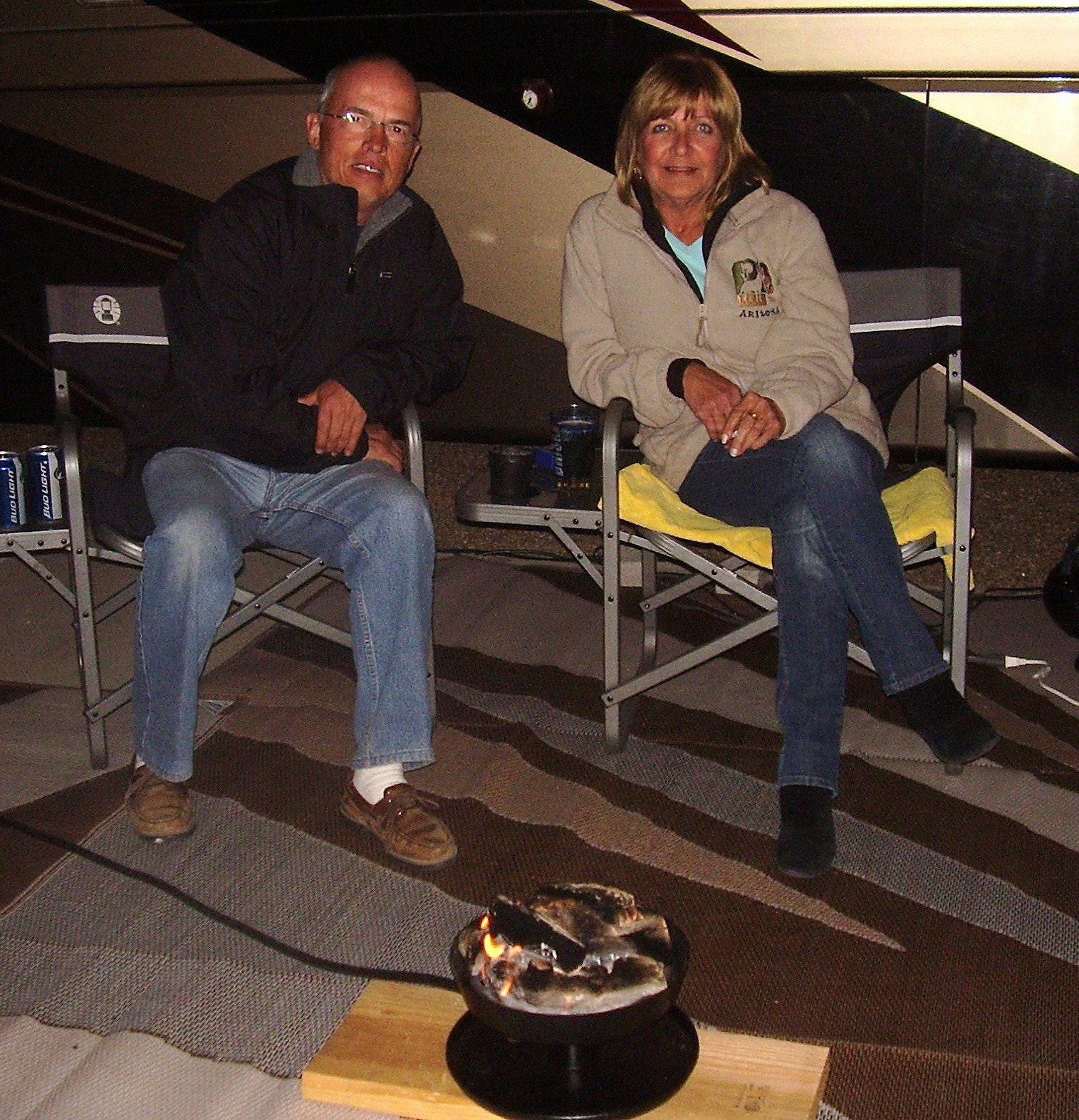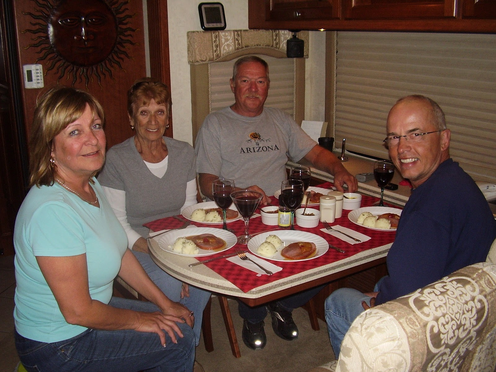 Nous partageons notre passion du caravaning avec plusieurs amis caravaniers et malgré le fait que nous soyons en contact internet depuis plus de 2 ans avec Danielle Dumontier (ex collègue de travail ) et son époux Gaétan, nous n'avions pas eu la chance de les visiter à ce jour. Quoi de mieux qu'un petit détour pour la journée à leur camping situé à Mesa pour ainsi prendre de leurs nouvelles. Les sujets de discussions ne manquaient pas tant autour du feu accompagné de Jeanne D'Arc la mère de Danielle que pendant le succulent repas que nos hôtes nous avaient préparé . Compte tenu du temps qui filait rapidement, nous en avons profité le lendemain matin, café en main pour poursuivre notre bavardage. Alors Danielle et Gaétan, nous vous disons à la prochaine.